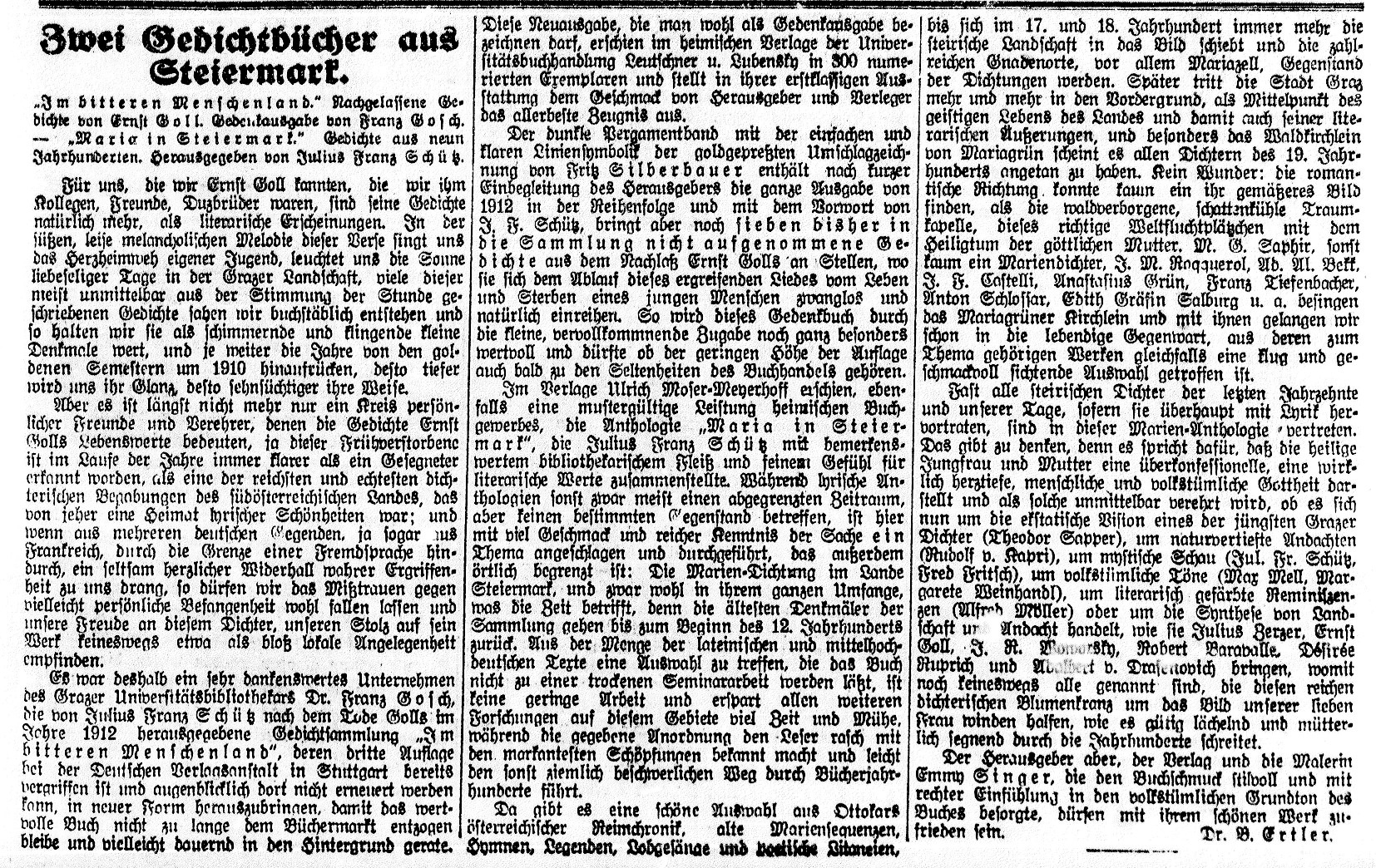 Während Burghausers Nachruf ganz aus der Windischgrazer Perspektive geschrieben ist, wusste Bruno Ertler so genau und liebevoll wie kein anderer die Grazer Seite und das Grazer Leben Golls zu schildern, in einem Artikel, der zum 10. Todestag des toten Freundes im "Neuen Grazer Tagblatt" zu lesen war. Viereinhalb Jahre später meldete sich Ertler in Sachen Goll noch einmal, ein letztes Mal vor seinem baldigen Tod, zu Wort, mit einer kurzen Rezension der bei Leuschner & Lubensky erschienenen, um sieben Gedichte erweiterten Neuausgabe des "Bitteren Menschenlandes":